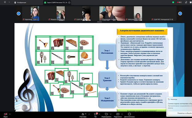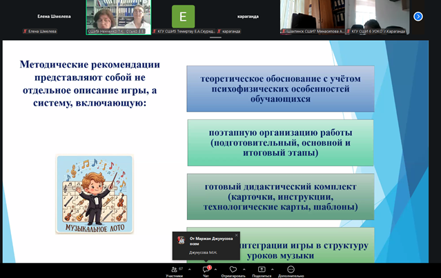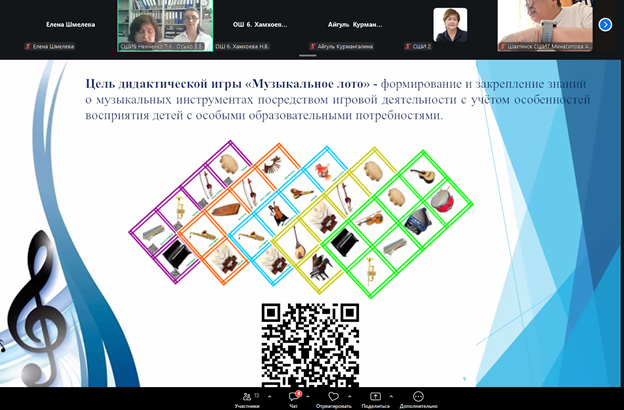 06 апреля 2026 года педагоги КГУ «Специальной школы-интерната №9» УОКО: Ненченко Татьяна Костасовна учитель музыки и пения, учитель-дефектолог, Осыко Виктория Владимировна учитель-логопед, учитель-дефектолог, провели мастер-класс на тему использования дидактической игры «Музыкальное лото» для формирования представлений о музыкальных инструментах у обучающихся с лёгкими нарушениями интеллекта. В ходе встречи рассмотрели особенности музыкального восприятия у детей с легкими нарушениями интеллекта, обсудили значение игровых и мультисенсорных технологий, а также представили авторскую разработку, объединяющую зрительное, слуховое и двигательное восприятие. Особое внимание уделили использованию QR-кодов и аудиоматериалов, которые делают игру более интерактивной, доступной и интересной для обучающихся. Благодарим коллег за внимание, активность и интерес к вопросам музыкального образования детей с легкими нарушениями интеллекта!