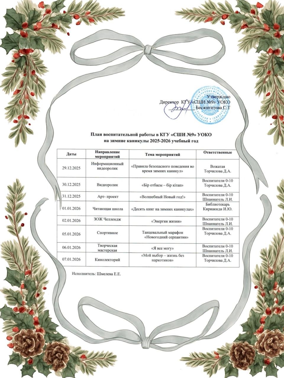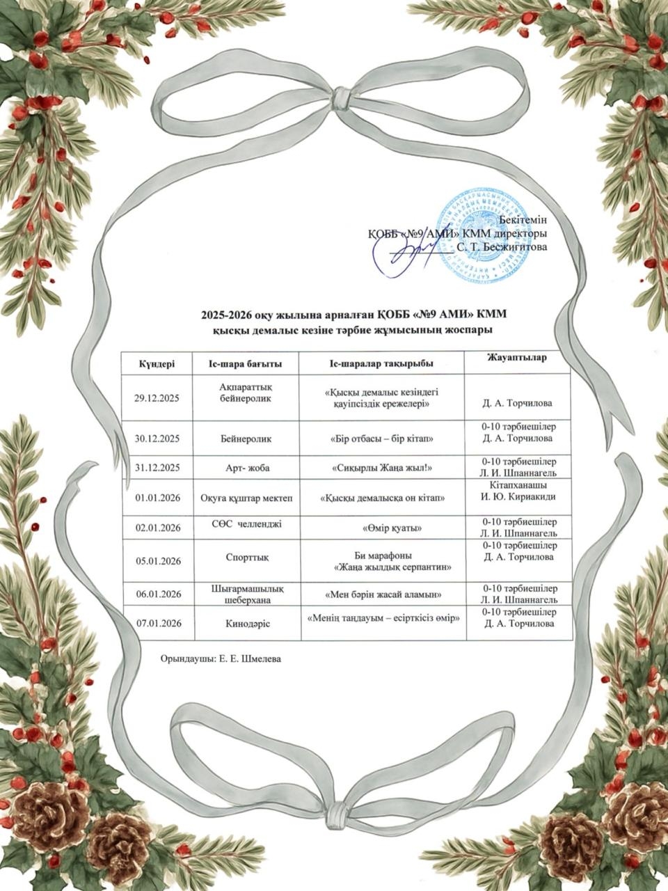 2025-2026 оқу жылына арналған ҚОББ «№9 АМИ» КММ қысқы демалыс кезіне тәрбие жұмысының жоспары.План воспитательной работы в КГУ «СШИ №9» УОКО на зимние каникулы 2025-2026 учебный год.