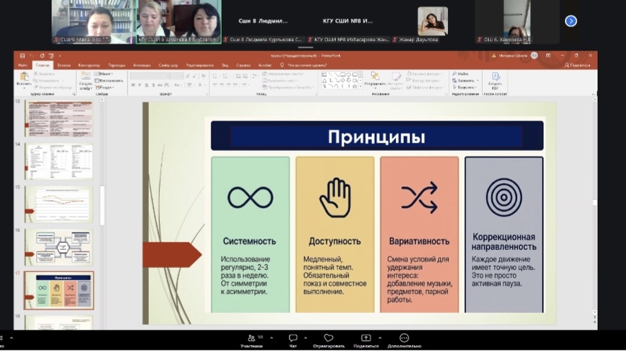 2026 жылғы 9 сәуірде ресурс орталығы аясында дефектолог мұғалімдер Е. Е. Шмелева, Т. А. Довгопол, Л. А. Тугельбаева ZOOM платформасында «Бастауыш сыныптағы зерде бұзылыстары бар балалармен оқу-тәрбие процесінде нейроойындар мен нейрогимнастика жаттығуларын қолдану» тақырыбында шеберлік сабағын өткізді. Шеберлік сабақ барысында педагогтер зерде бұзылыстары бар білім алушылардың ми жарты шарларының өзара әрекеттесуін белсендіруге, танымдық процестерін дамытуға және іс-әрекетті ерікті реттеу деңгейін арттыруға бағытталған түзету-дамыту жұмыстарының жүйесін ұсынды. Сонымен қатар, сабақтың әр кезеңінде нейроойындар мен нейрогимнастика элементтерін қолданудың практикалық тәсілдерін көрсетті. Ерекше назар қимыл-қозғалыс үйлесімділігін, көру-қимыл интеграциясын, зейін мен есте сақтауды дамытуға бағытталған жаттығуларға аударылды.