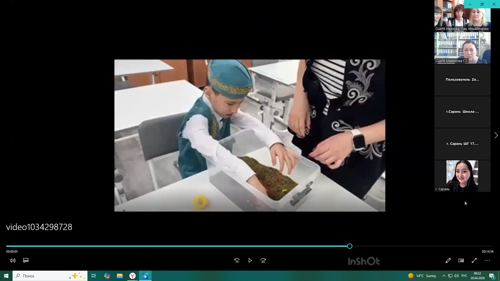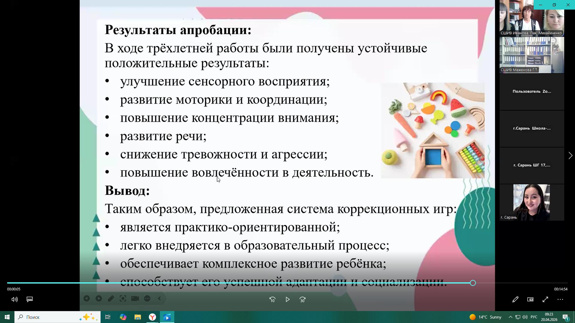 17 сәуір күні орташа зерде бұзылыстары бар білім алушылардың сенсорлық интеграциясын дамыту тақырыбында шеберлік сабағы өткізілді. Онда дефектолог-педагогтер И. К. Михайличенко, А. И. Иванова, Е. А. Пак сөз сөйледі. Педагогтер орташа зерде бұзылыстары бар білім алушылардың сенсорлық интеграциясын дамыту бойынша әдістемелік ұсынымдар ұсынды. Олар сенсорлық дамудың маңыздылығы, мұндай балалардың ерекшеліктері туралы айтып, ойын жаттығуларына негізделген түзету жұмысының жүйесін таныстырды. Сонымен қатар бағдарламаны жүзеге асырудың мақсаттары мен міндеттері, кезеңдері, сабақтарды ұйымдастыру қағидаттары және балалардың дамуындағы қол жеткізілген оң нәтижелер баяндалды.